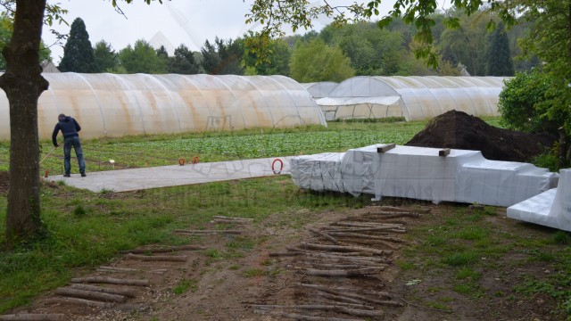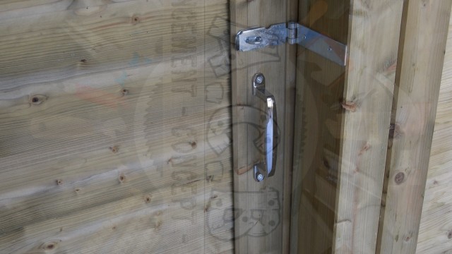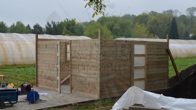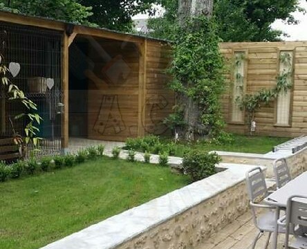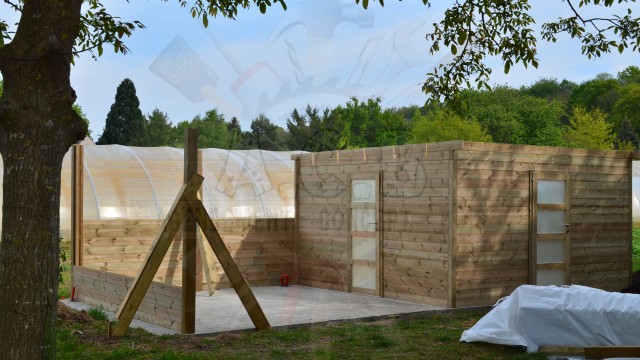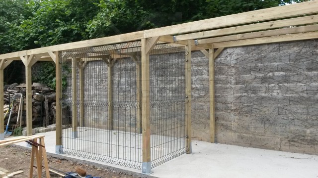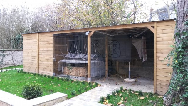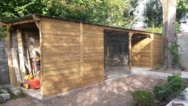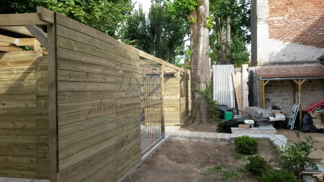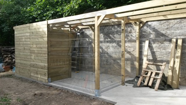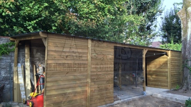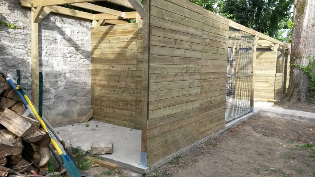 Combiné sur mesure: création sur demande : abris bûches, chenil double (une partie fermée, l’autre en grillage) et un abri entièrement fermé pour les outils de jardin.