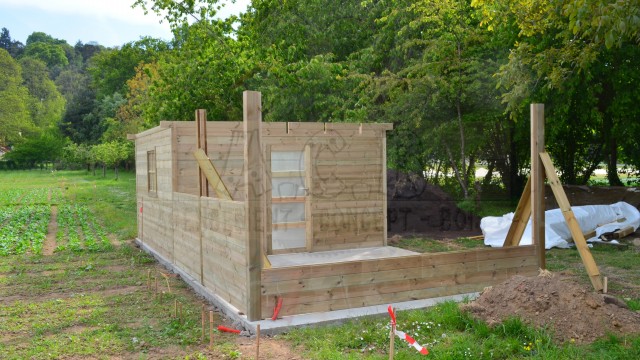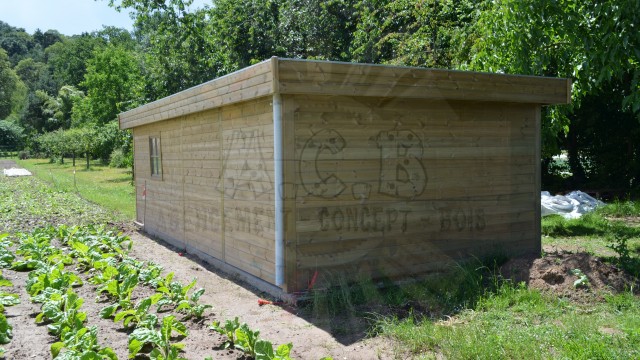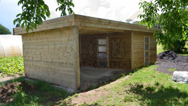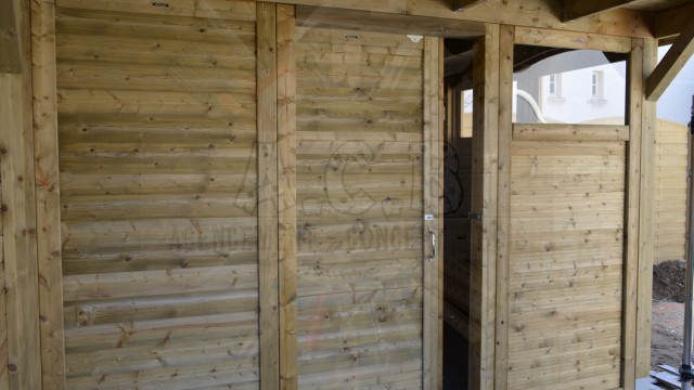 Abris avec auvent: la moitié entièrement fermée avec porte et fenêtre et l’auvent un côté ouvert.