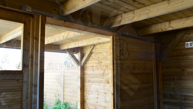 Abris semi fermé: une partie cloisonnée avec fermeture par porte coulissante et l’autre moitié avec 2 côtés non fermés mais couverts