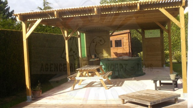 Espace de vie avec ombrière: vous manger sous la partie couverte et vous détendez sous la semi-couverte, avec ombrage.